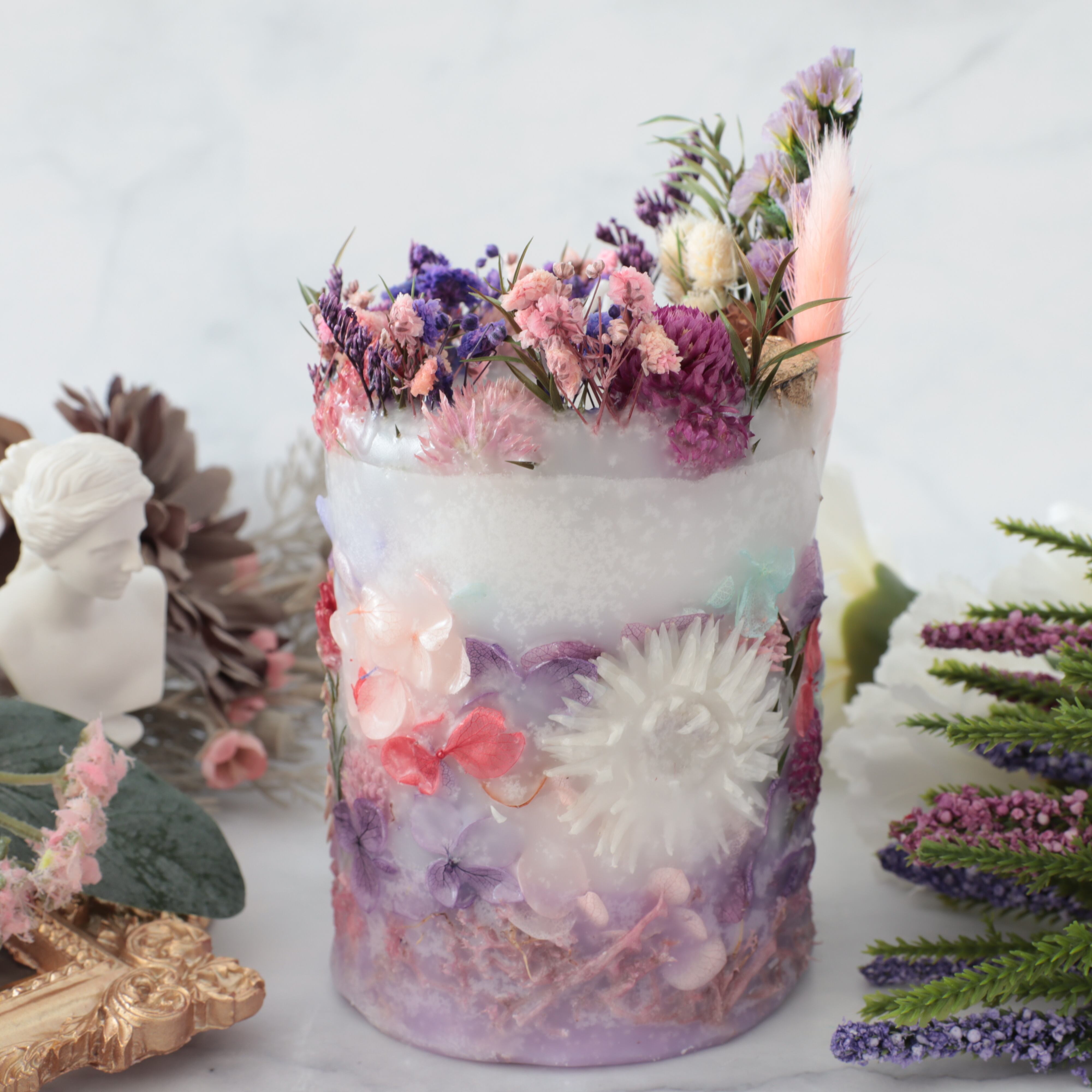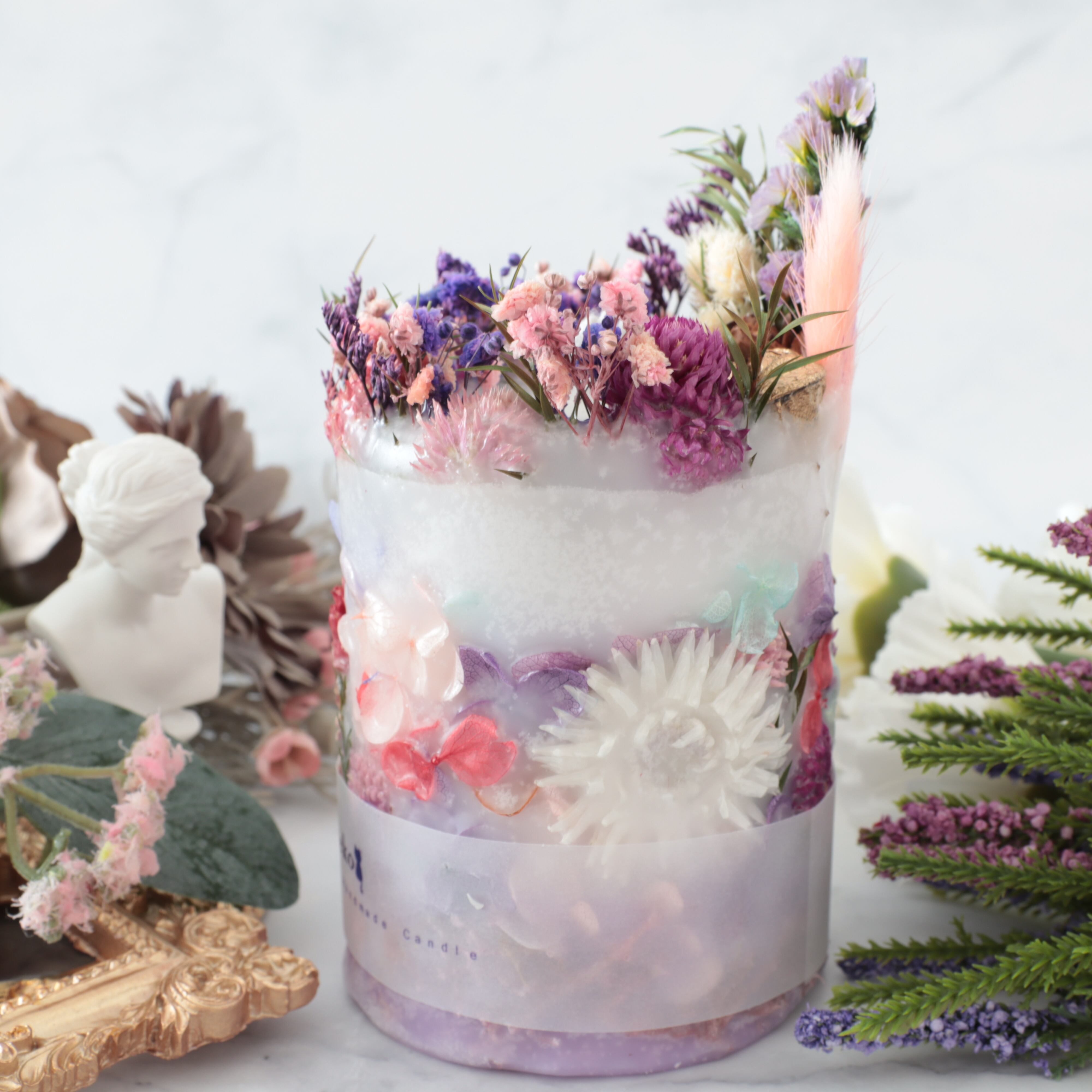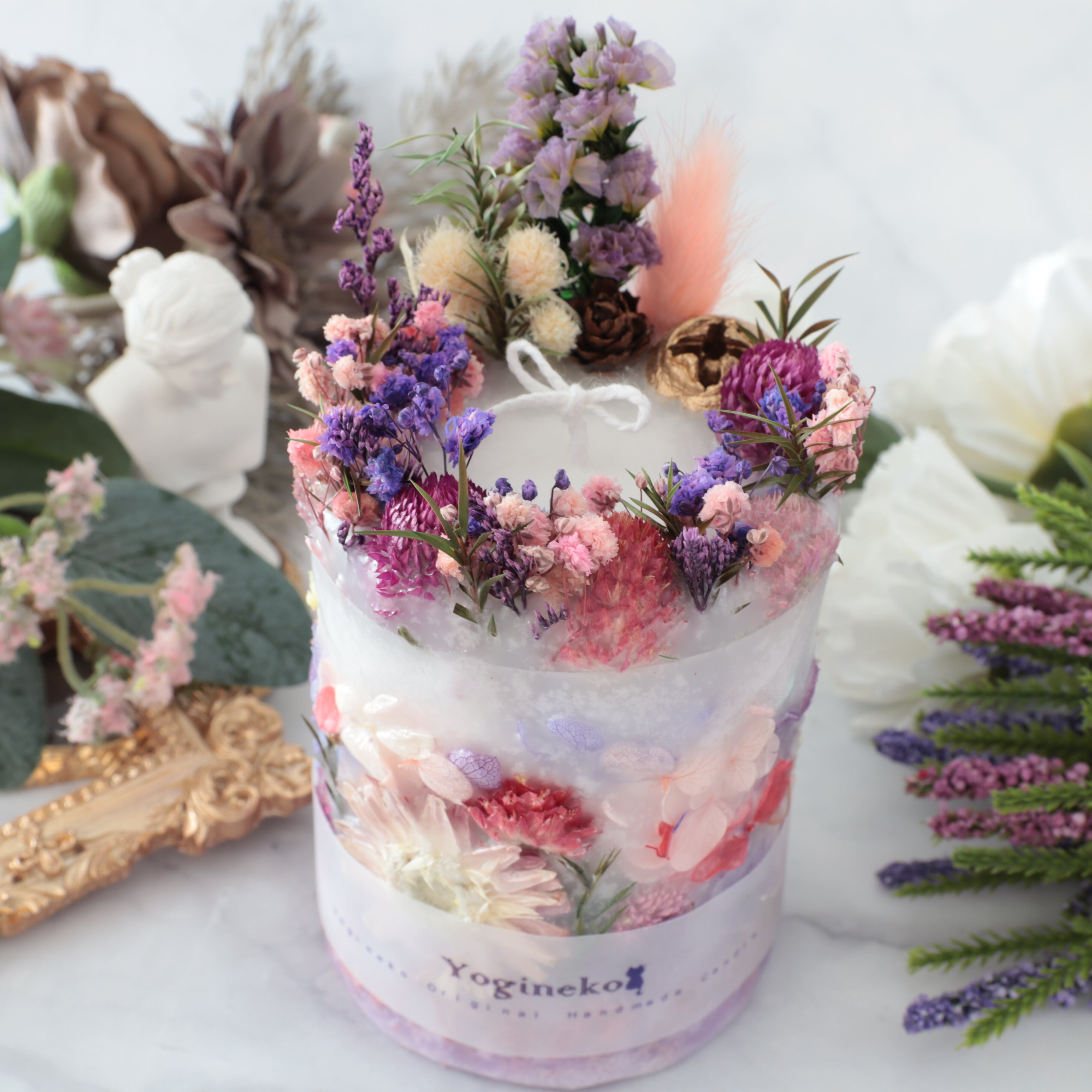 ボタニカルキャンドルは、花材に燃え移りやすいので常に芯を短くして、外枠が溶けないようにしてください。