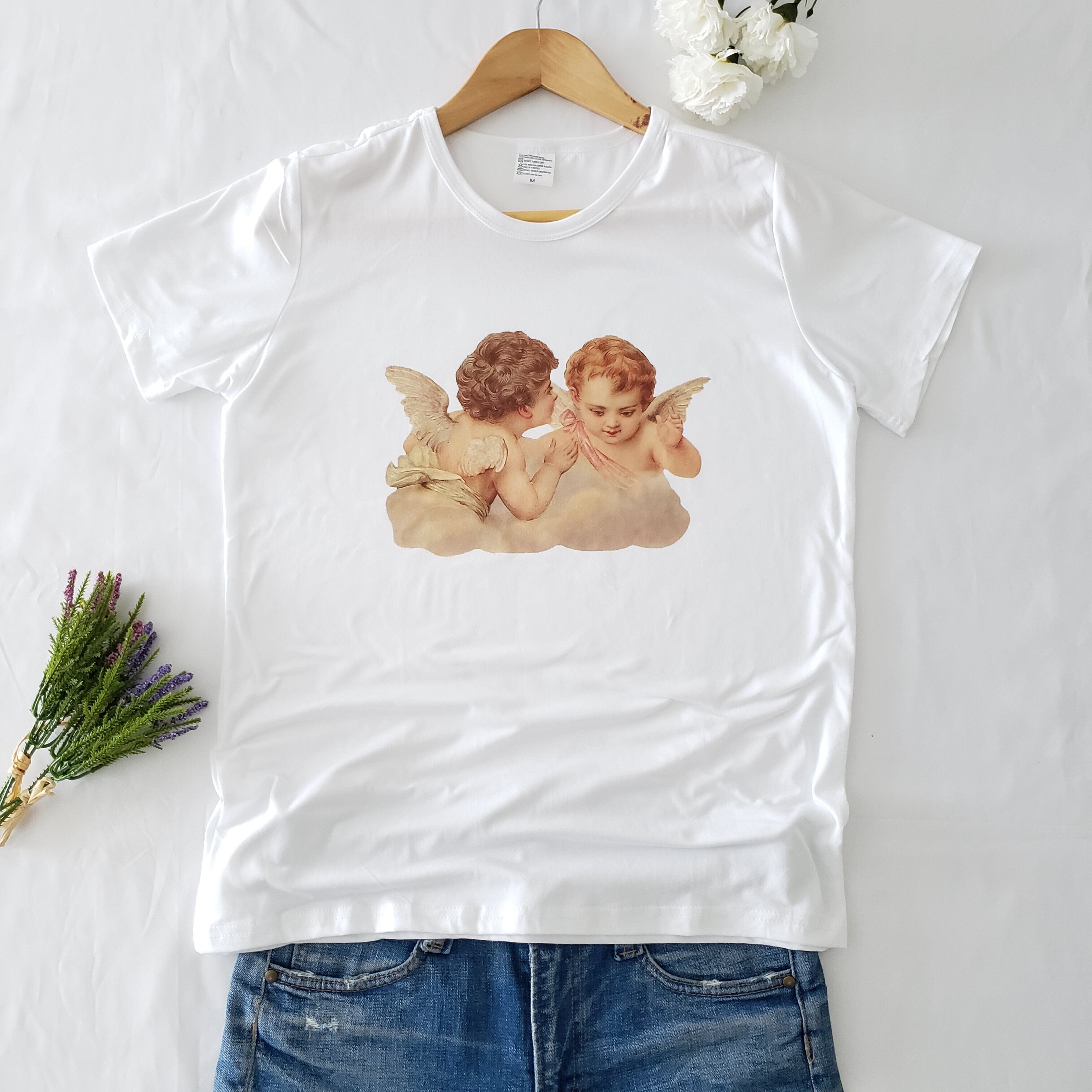ホワイトTシャツに可愛い天使だちがプリントされ、