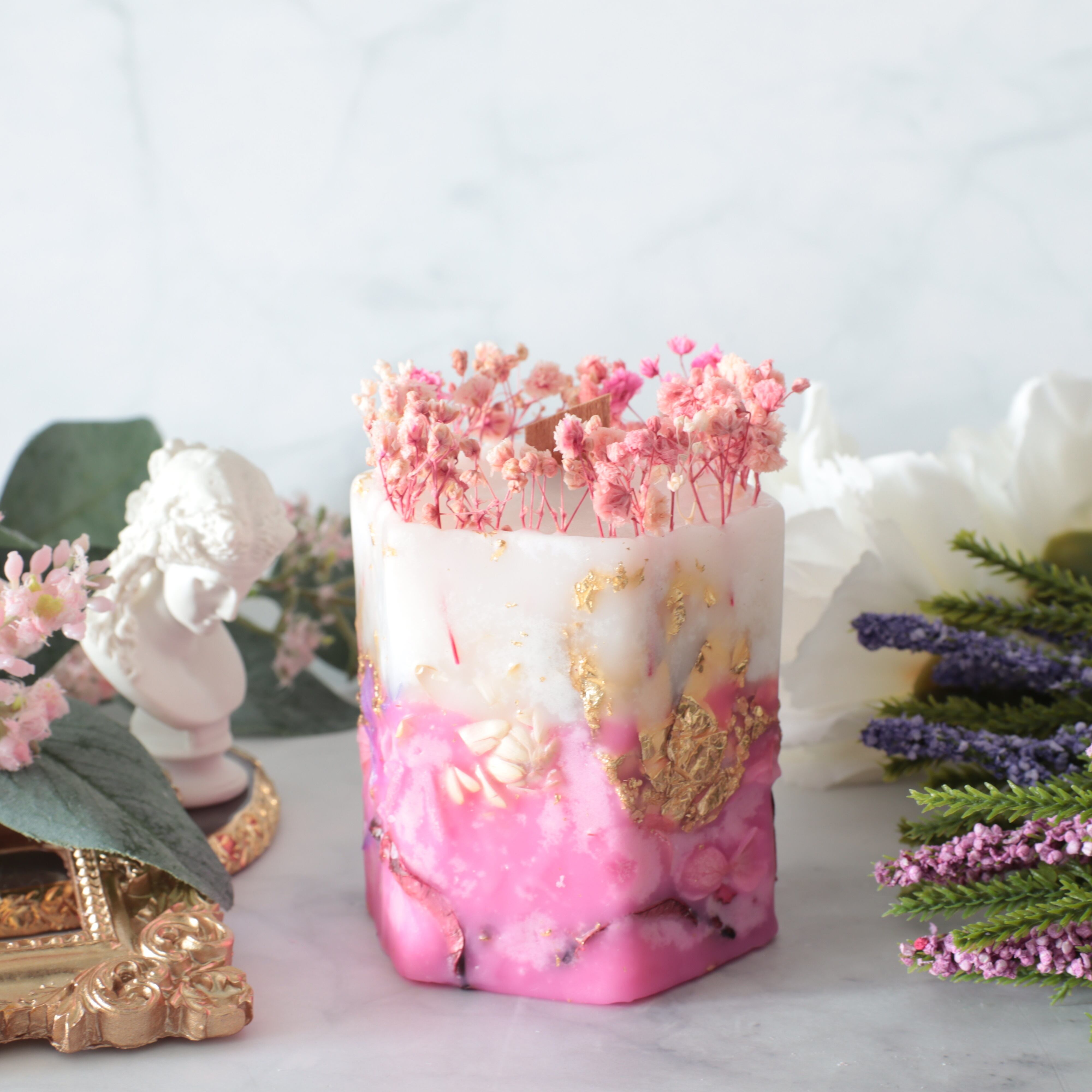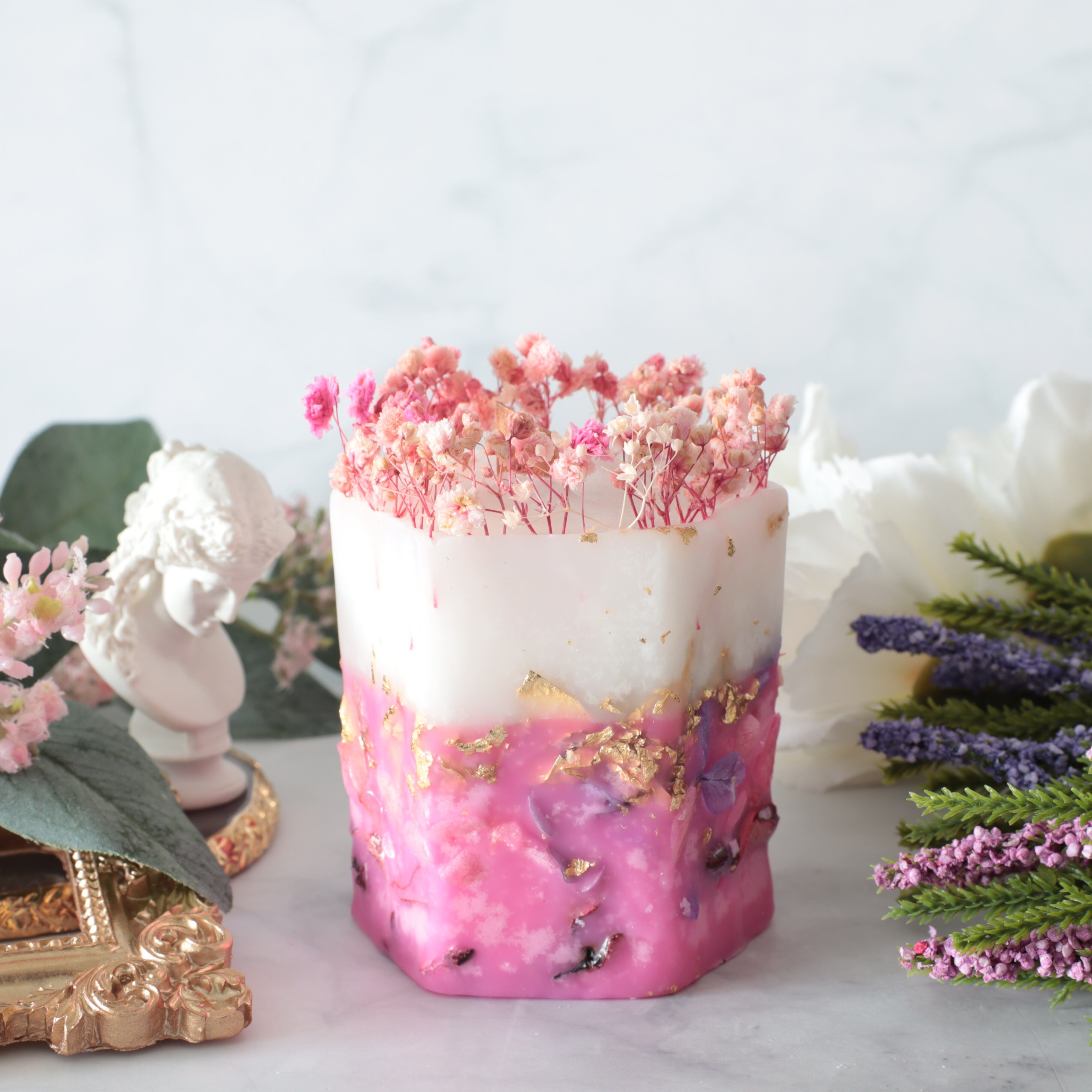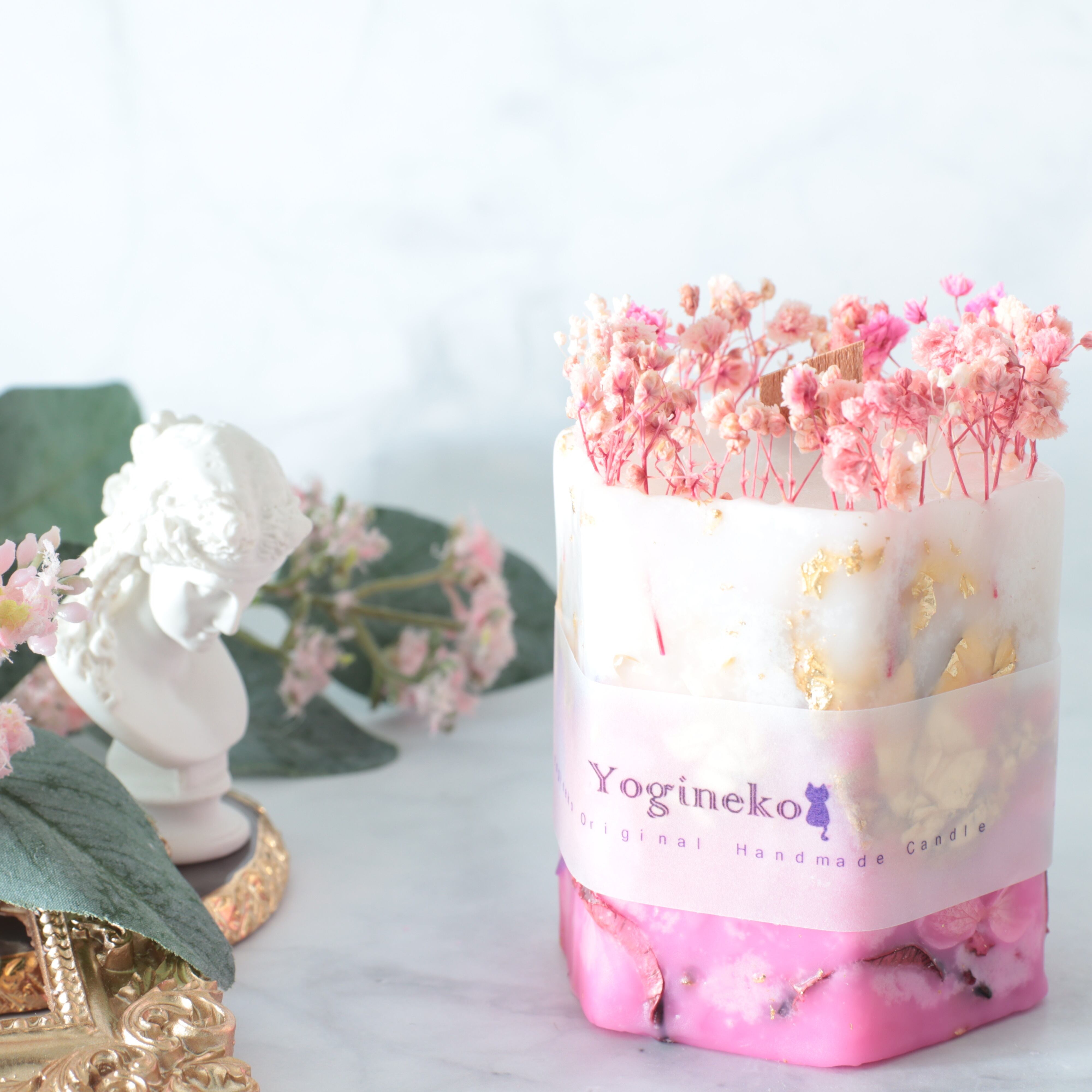 ※花材に燃えうつらないよう、炎に近づかないようにピンセットなどで取り除いてください。ボタニカルキャンドルは、花材に燃え移りやすいので常に芯を短くして、外枠が溶けないようにしてください。